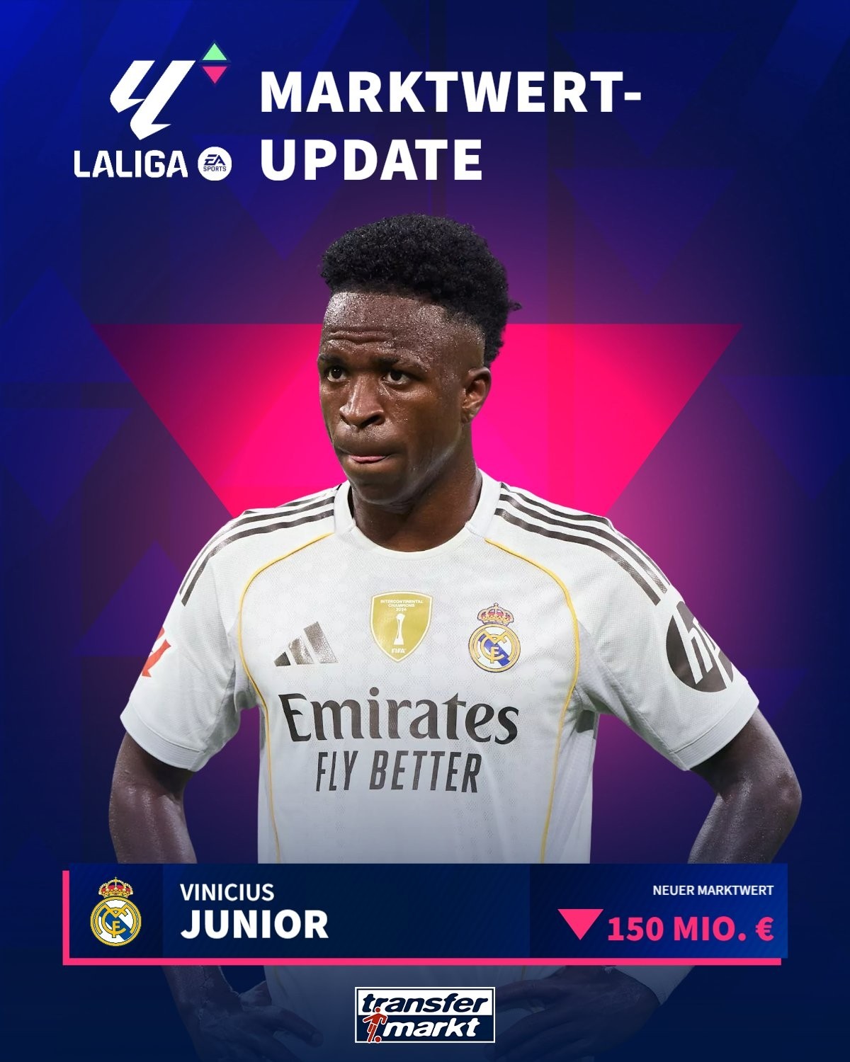 北京时间10月2日,德转官方更新了西甲球员的身价,其中皇马前锋维尼修斯身价下降2000万欧,来到1.5亿欧。